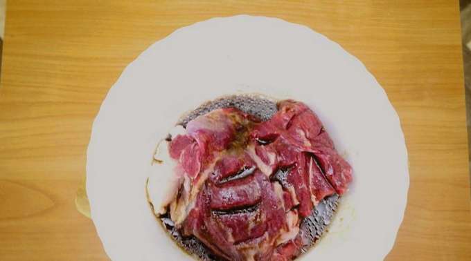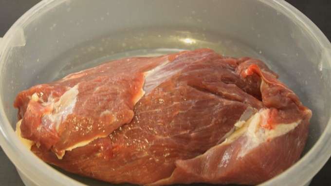 - Was het vlees goed en dep droog met keukenpapier, verwijder de films. Rasp het vlees met de gekookte marinade. Doe het vlees in een bak en draai het vast met huishoudfolie, plaats het ongeveer 1,5-2 uur in de koelkast.
