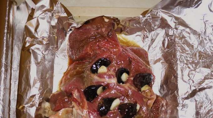 - Pel de knoflook en spoel af. Op de bodem van de schaal waarin je het vlees gaat bakken, leg je de folie in meerdere lagen. Leg vervolgens het vlees neer. Vul de sneetjes met pruimen en knoflook.