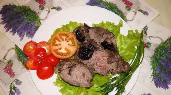 - Serveer mals rundvlees met pruimen, gebakken in folie, serveer in porties met verse groenten en kruiden.