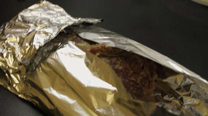 - Wikkel het rundvlees stevig in folie gewikkeld in meerdere lagen. Zorg dat alles verzegeld is.