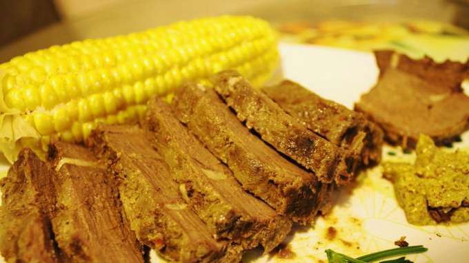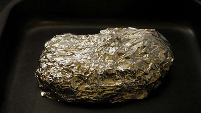 - Wikkel het rundvlees stevig in folie gewikkeld in meerdere lagen. Zorg dat alles verzegeld is. Plaats de vorm in de oven en bak het vlees 60 minuten op een temperatuur van 200 graden.