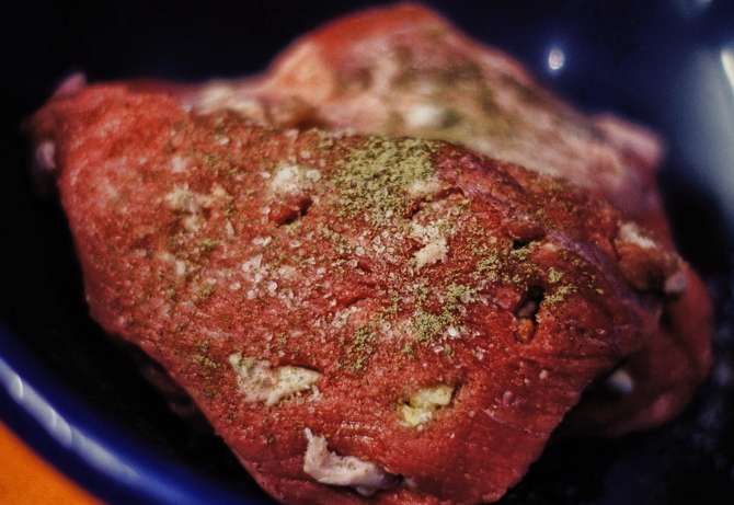 - Was het vlees goed en dep droog met keukenpapier, verwijder de films en snijd in kleine stukjes, je kunt er lichtjes op kloppen met een hamer. Breng op smaak met zout, kruiden en zwarte peper. Wrijf goed in het vlees.