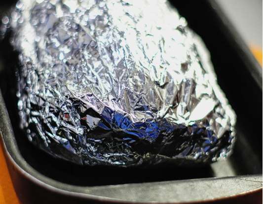 - Op de bodem van de schaal waarin je het vlees gaat bakken, leg je de folie in meerdere lagen. Leg vervolgens het vlees neer.
