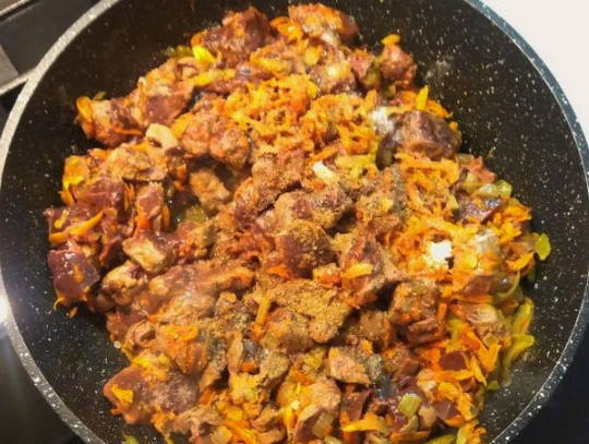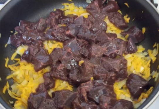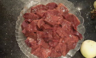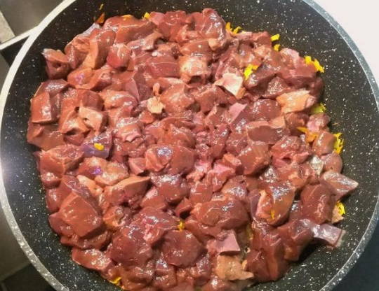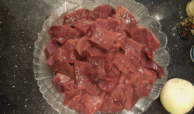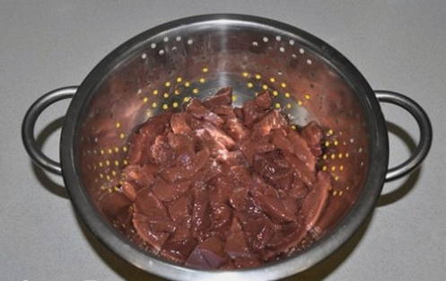 - We wassen de runderlever en snijden in kleine stukjes. We sturen het ingrediënt naar een groentebak.