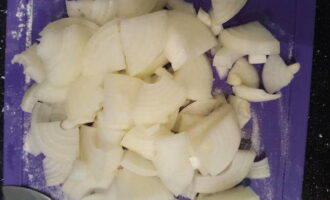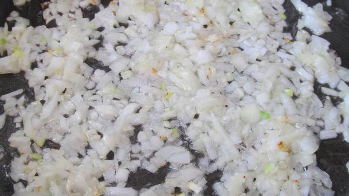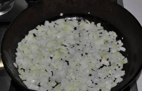 - Snijd de ui en knoflook fijn. Bak het voedsel tot het aroma in plantaardige olie verschijnt.