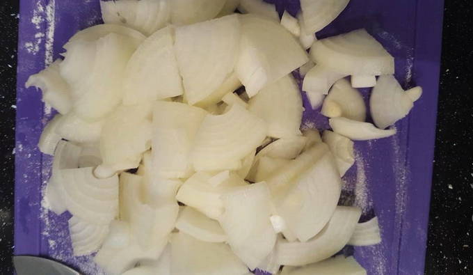 - Snipper de uien en bak ze transparant in een pan.