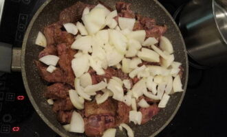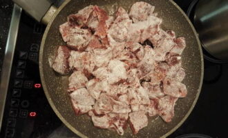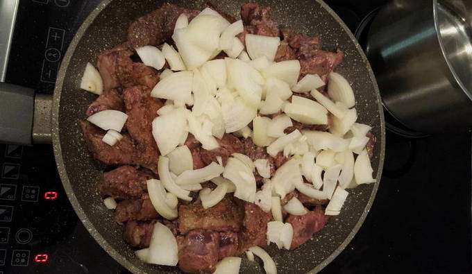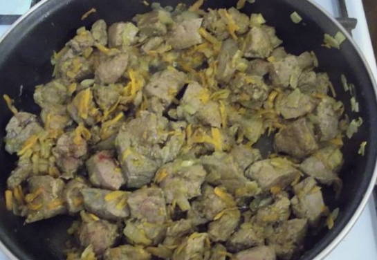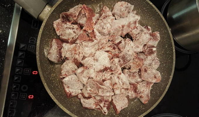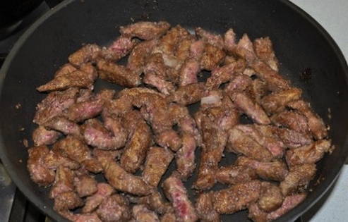 We verspreiden het rundvleesproduct in een koekenpan met olie en bakken tot de schaduw verandert.