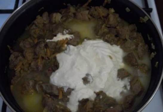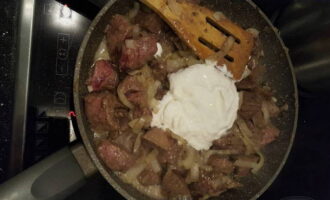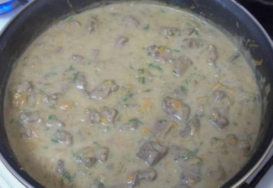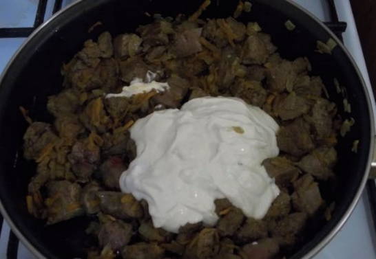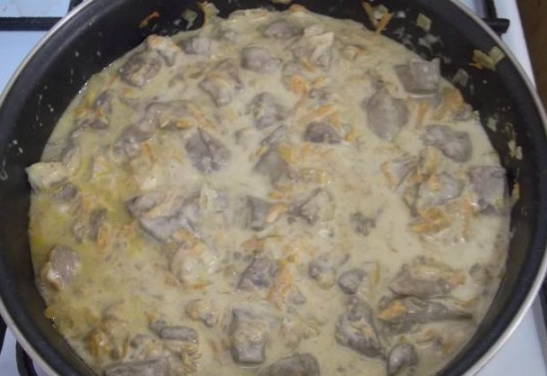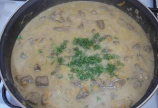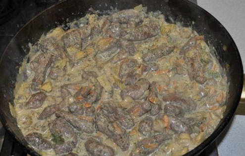 - Combineer de gebakken lever met champignons en groenten. Giet hier zure room, roer en laat ongeveer 10 minuten sudderen.