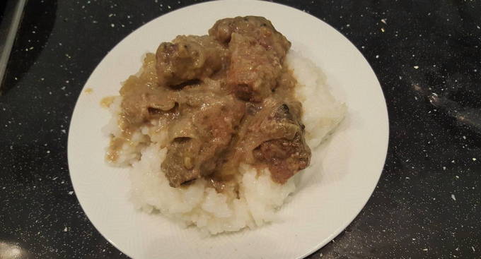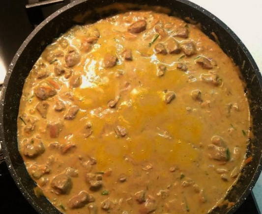 Runderlever in zure roomsaus met uien in een pan