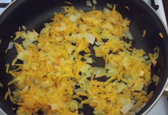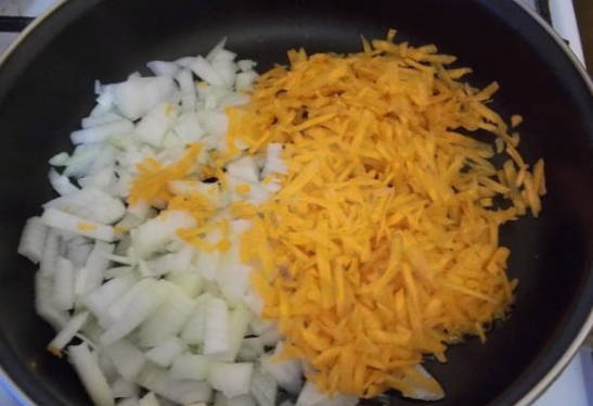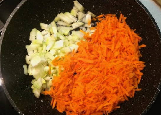 - Snipper de ui en rasp de wortelen fijn. Bak groenten in plantaardige olie tot ze zacht zijn.