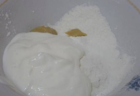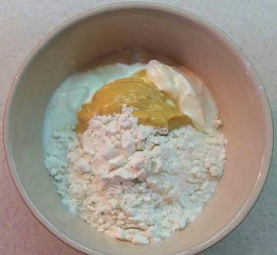 - Op dit moment combineren we zure room, mosterd en bloem in een gemeenschappelijk bord. Meng grondig.