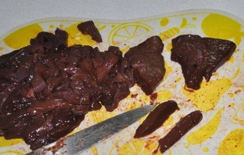 - We snijden de voorbereide lever in kleine stukjes en sturen deze naar de groentebak.