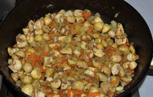 - Voeg hieraan fijn geraspte wortelen en gehakte champignons toe.We bakken de producten tot ze gaar zijn.