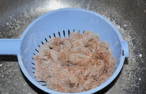 - We brengen het product opnieuw over in een vergiet en schudden het af van het overtollige droge ingrediënt.