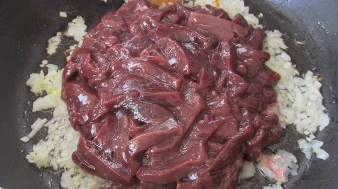 - Spoel de runderlever grondig, verwijder de film en snijd in dunne reepjes.