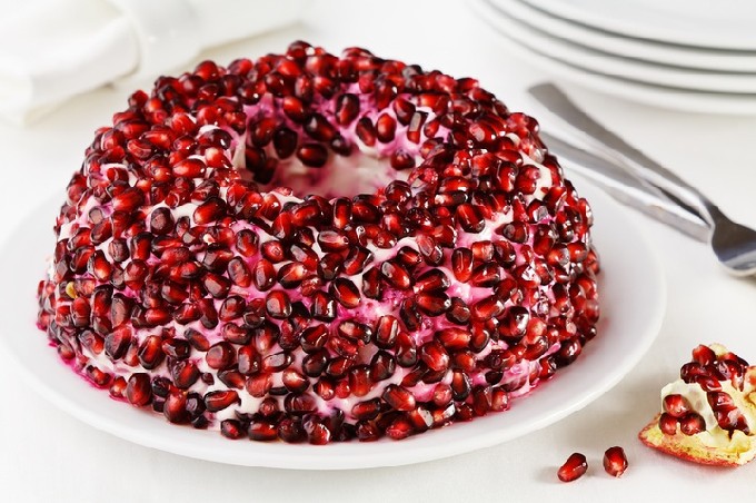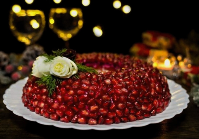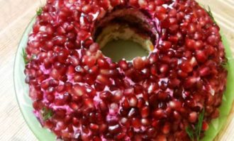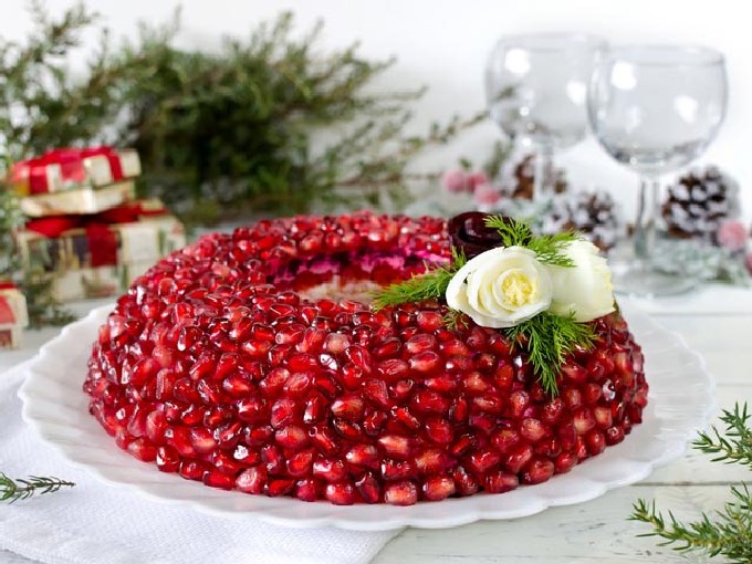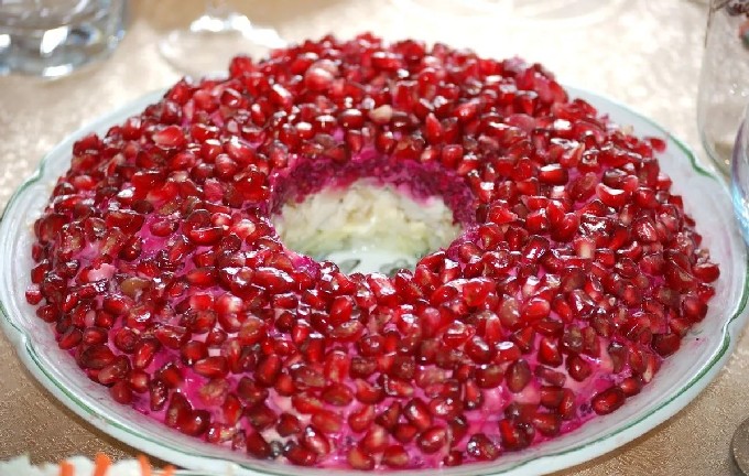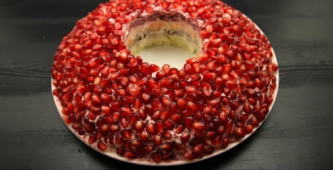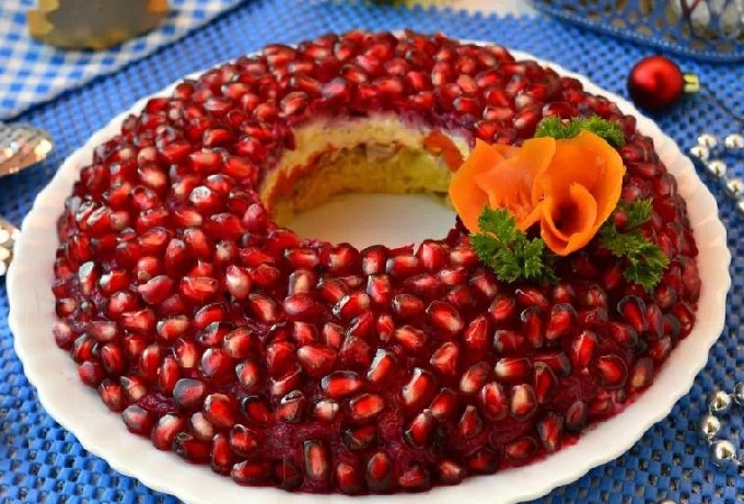 Granaatappelarmbandsalade is een voortreffelijke salade met een ongewone smaak. Het is al lang een favoriet vakantiegerecht geworden. Bereid in de vorm van een ring en versierd met granaatappelpitjes, wordt de salade een echt culinair meesterwerk. Maak je klaar om complimenten van gasten te ontvangen!
