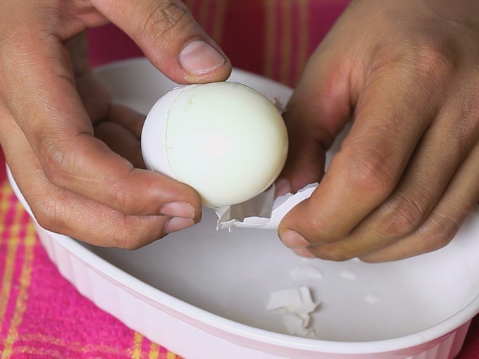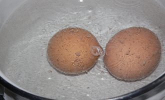 Dompel de eieren in gezouten water en kook ze 8 minuten. Koel de afgewerkte eieren onder koud stromend water.