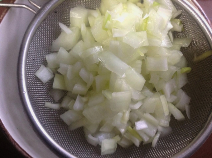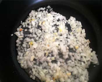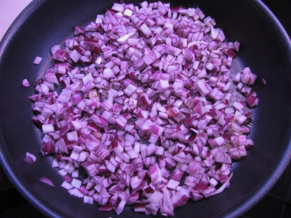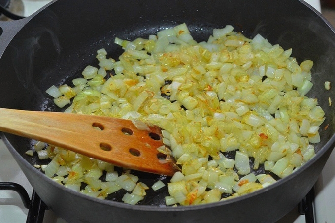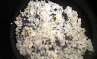 - Pel de ui en snij in kleine stukjes. Bak ze in plantaardige olie tot een lichte blos en zachte staat.