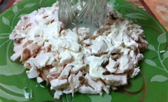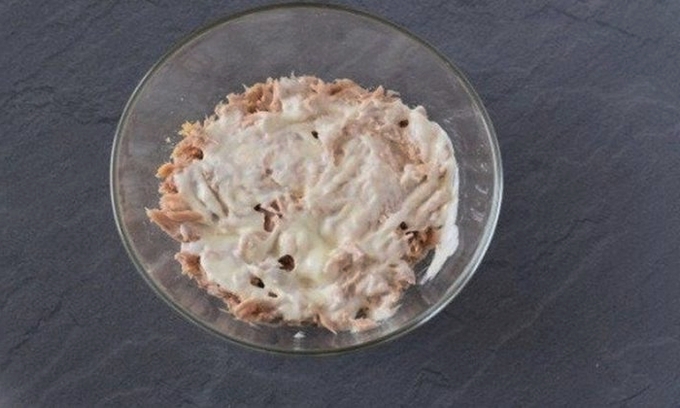 - Maal de vis voorzichtig en heel voorzichtig met een vork. Voeg er 2 eetlepels mayonaisemengsel aan toe, peper.