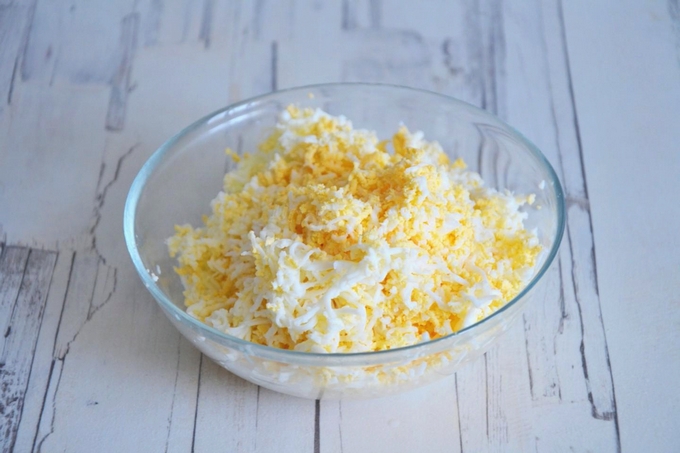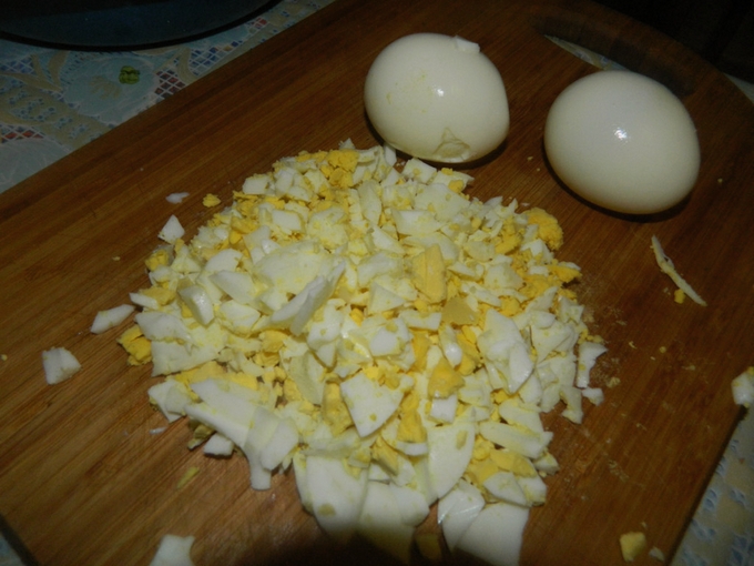 - Kook de eieren, koel ze af onder stromend water. Bedek de eieren en meng ze met twee eetlepels mayonaise.