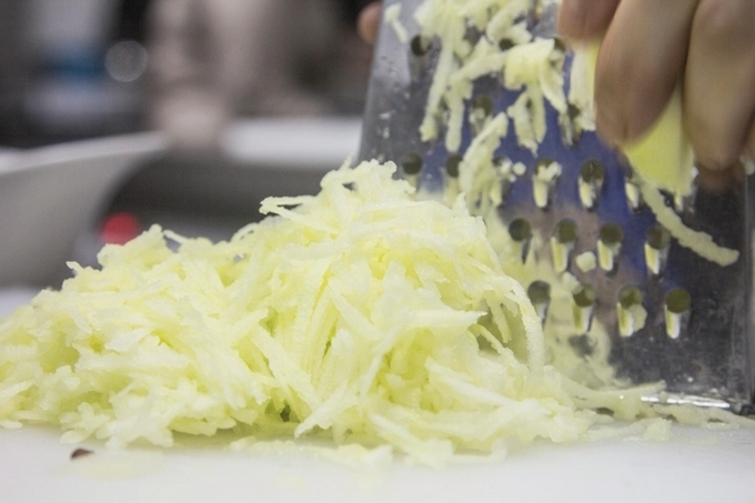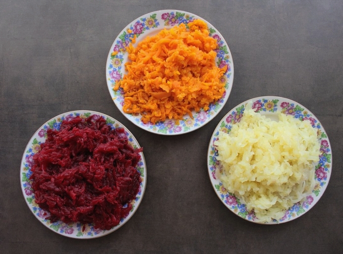 - Rasp de wortelen en bieten op een grove rasp en snijd de aardappelen in stukjes.