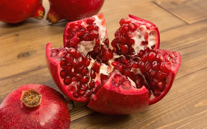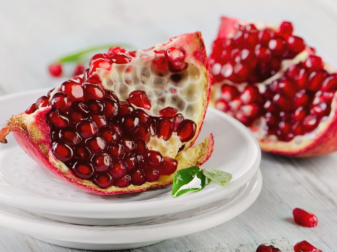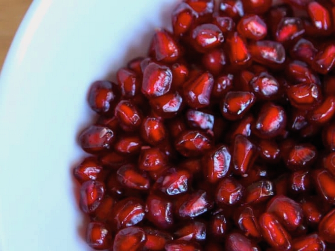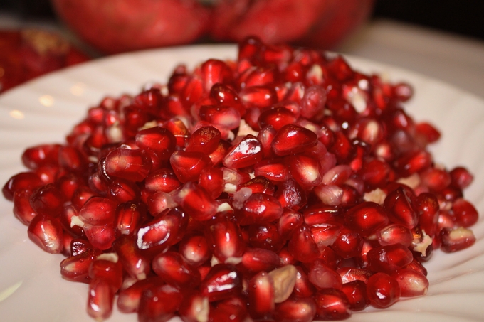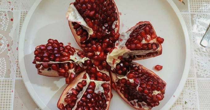 - We snijden de granaatappel en selecteren de korrels op de schotel.