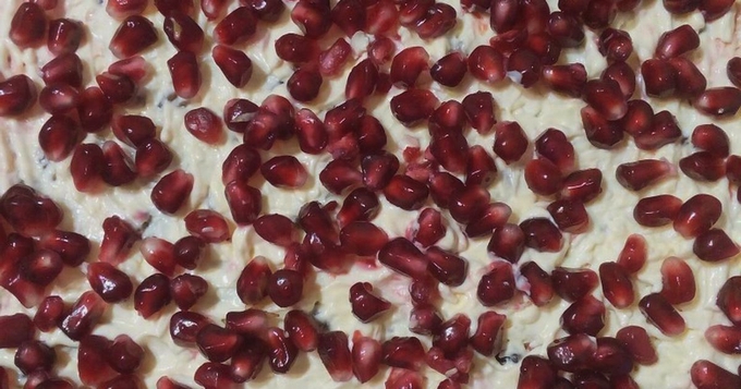 We verspreiden de resterende bieten. We vullen met mayonaise, plaatsen het zo dat de granaatappelpitjes erin kunnen blijven zitten, maar niet zinken.
