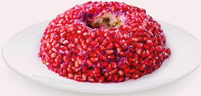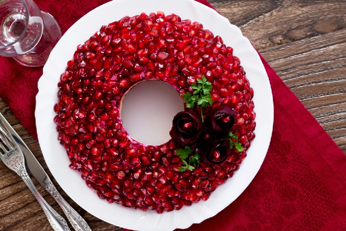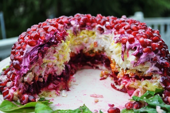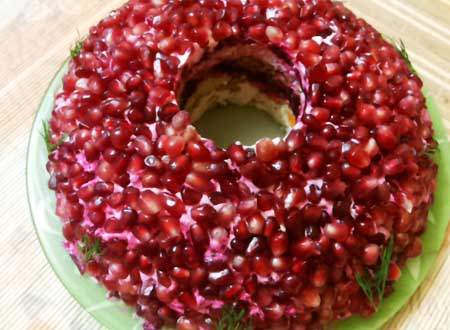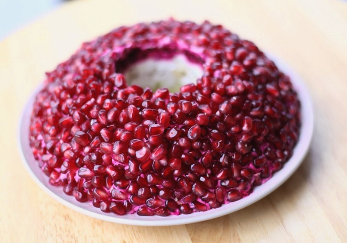 Granaatappelarmbandsalade met vis is een heel speciaal soort traditioneel feestgerecht. Deze salade heeft een bijzondere delicate smaak, met hints van zee en lichte zuurheid. Het ziet er altijd spectaculair uit op tafel en geeft het een bijzondere verfijning.