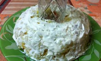 - We zetten een glas in het midden van het bord en verzamelen de salade eromheen. Leg het vlees in de eerste laag. We schenken het met mayonaise (kies de hoeveelheid naar uw smaak). Bestrooi met zout en peper.