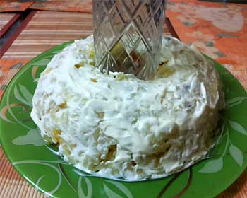 - Neem een plat bord en plaats een glas in het midden. En verdeel de mayonaisemassa rond met een lepel in de vorm van een cirkel.