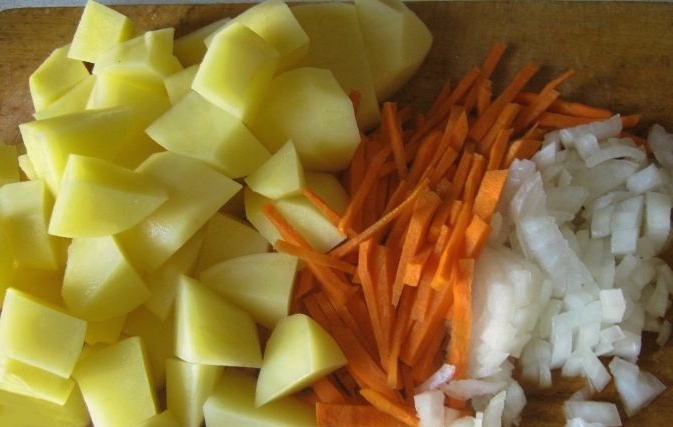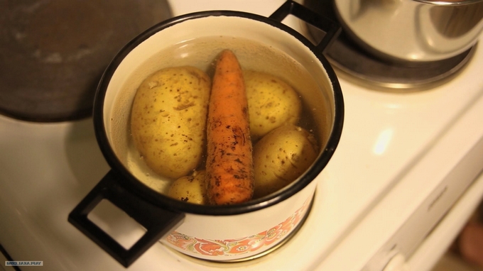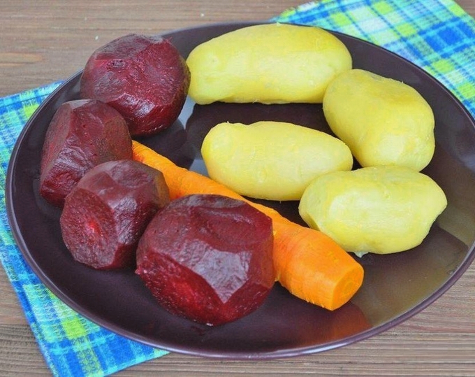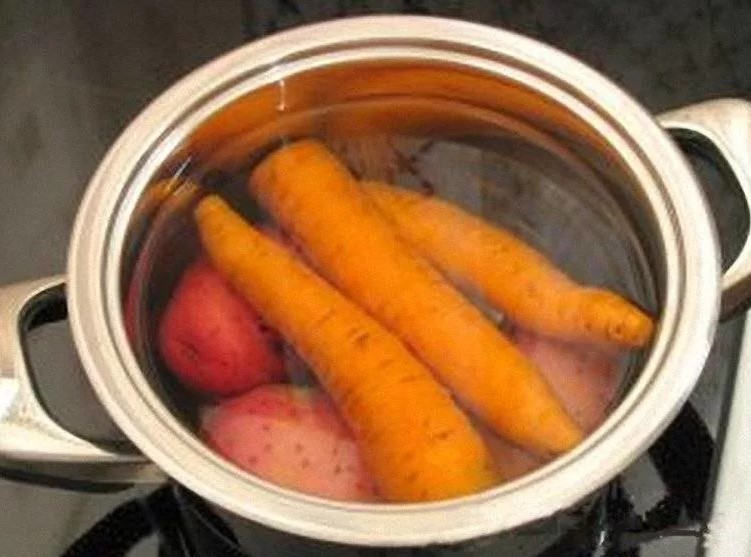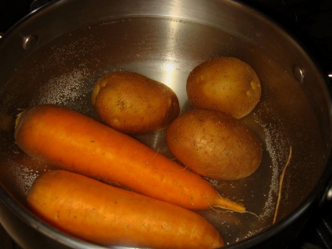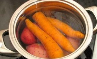 - Schil en kook wortelen en aardappelen; om het proces te versnellen, kun je ze samen koken.