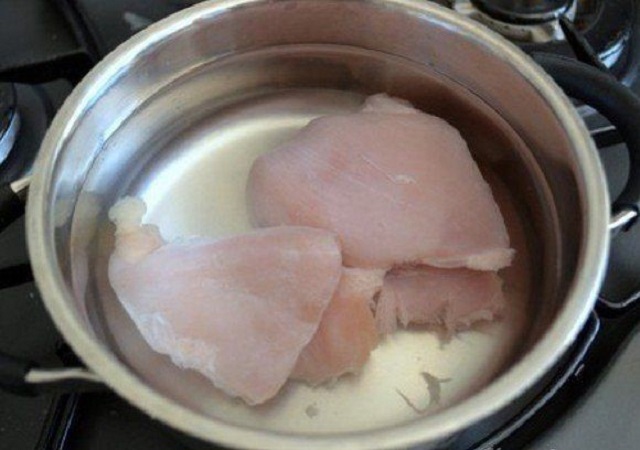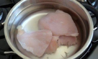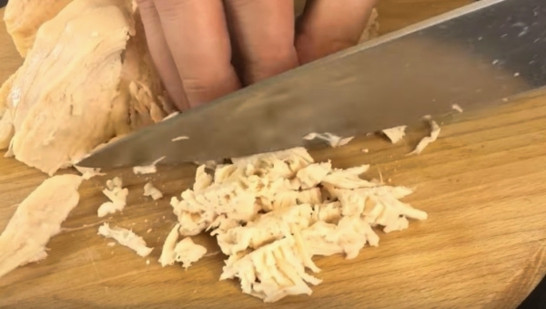 We wassen de filet en doen hem in een pan met water. We steken 25-30 minuten in brand. tot klaar. We halen de kip eruit en laten hem drogen. Verwijder het vel van de filet en de modus met dunne reepjes of vierkantjes.