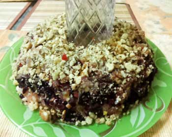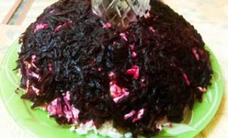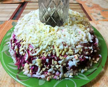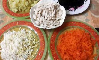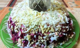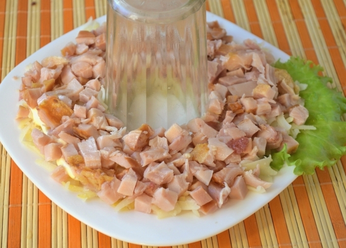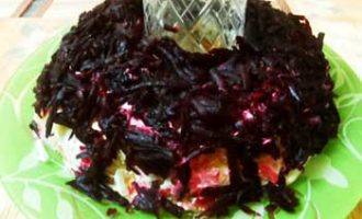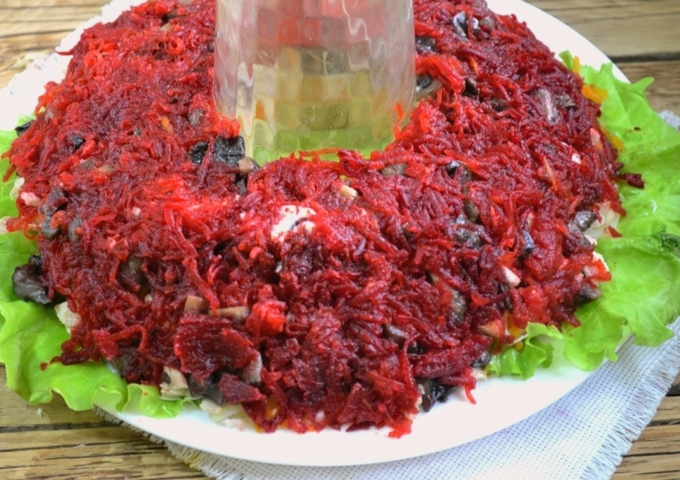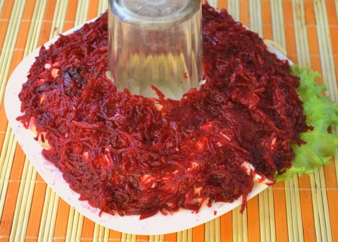 - We beginnen de salade vorm te geven. Zet hiervoor een glas in het midden op een groot bord of slakom. En nu beginnen we de lagen in een cirkel te leggen: leg het vlees eerst, bestrooi het met zout en kruiden, vet het in met mayonaise bovenop (bekijk de hoeveelheid naar eigen goeddunken). 2e laag - aardappel, vul deze ook met mayonaise. 3e laag wortelen en mayonaise, plus bestrooi alles met zout en peper. 4e laag pruimen en eieren, goed insmeren met mayonaise en bestrooien met noten. Leg de bieten met de 5e laag, vet in met mayonaise. Bestrooi tot slot royaal met granaatappelnucleoli.