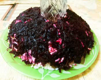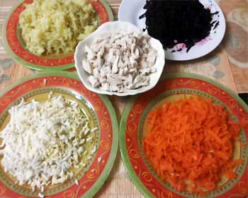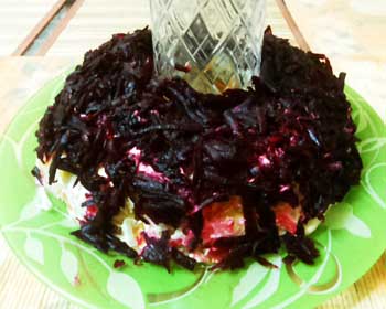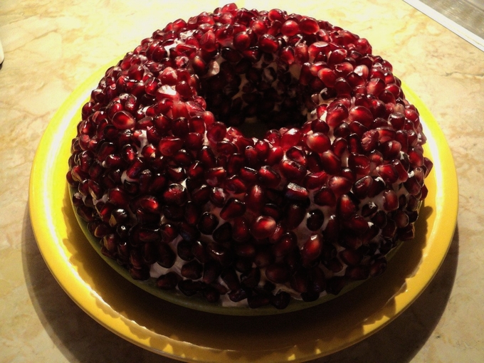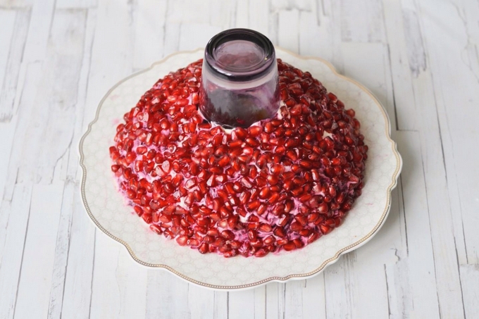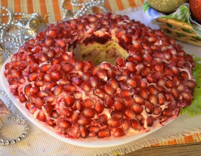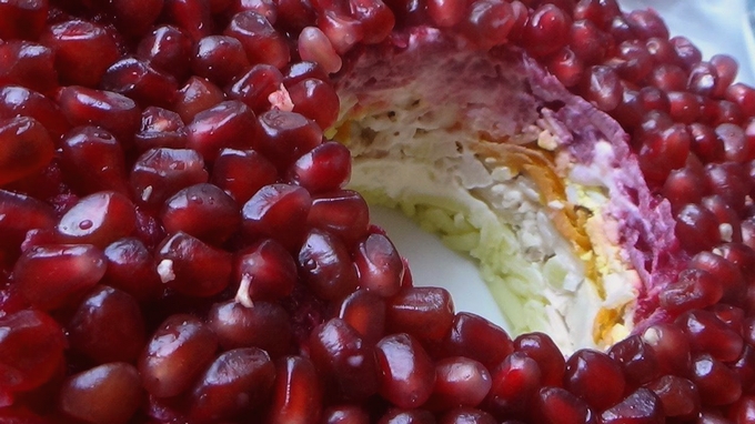 - Wij vormen het gerecht. Zet een glas in het midden van het bord. Leg er lagen omheen: kip, bestrijk met mayonaise erop, nu aardappelen, leg er ook mayonaise op, nu een deel van de wortel, bedek met mayonaise, eieren, vet rijkelijk in met mayonaise zodat ze niet verkruimelen, opnieuw wortelen en tot slot strak op elkaar aanbrengen, granaatappelpitjes gieten.