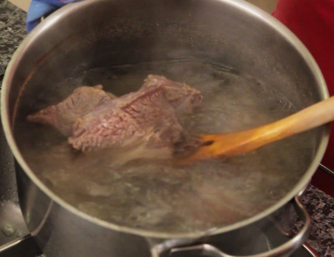 - We wassen het vlees, snijden het in verschillende delen en koken het in gezouten water.