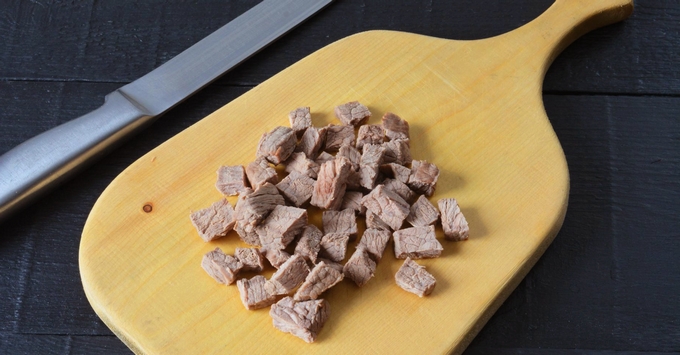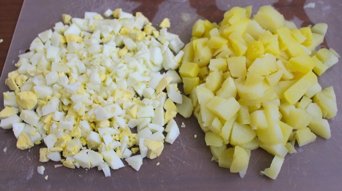 - Allereerst moet je de filets koken. We doen het in zout water en koken na het koken nog 20-30 minuten. Snijd de afgewerkte filet in kleine vierkantjes.