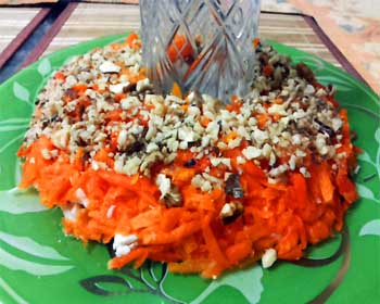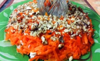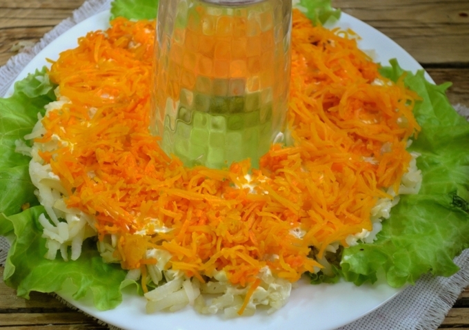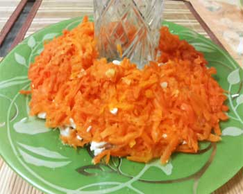 De volgende laag zijn geraspte wortelen. Nu moet je de salade zouten en kruiden.