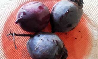 Om het koken te vereenvoudigen, kook je de bieten in de magnetron. Daarom spoelen we het grondig af en prikken het voorzichtig van verschillende kanten met een vork. We nemen een magnetroncontainer, gieten er een glas water in en dompelen de bieten onder. Dek af met een deksel en laat 10 minuten staan. in de modus "groenten". Als de tijd om is, opent u de magnetron, draait u hem om en herhaalt u de procedure.
