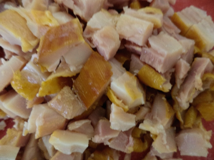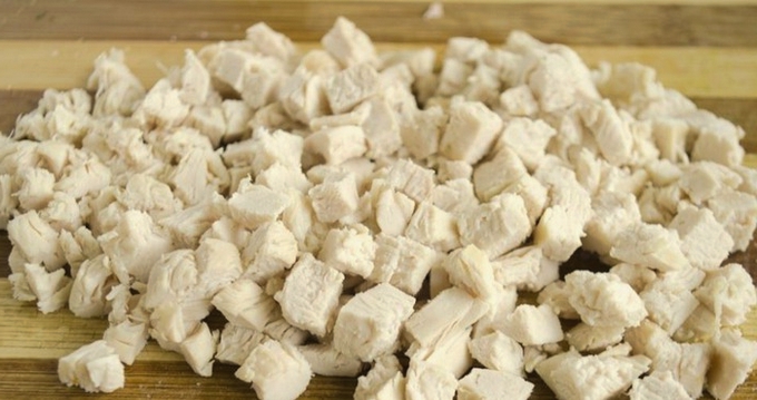 - Laten we nu de kip bereiden. We verwijderen de huid ervan en verwijderen de botten. Snijd het vlees in middelgrote blokjes.