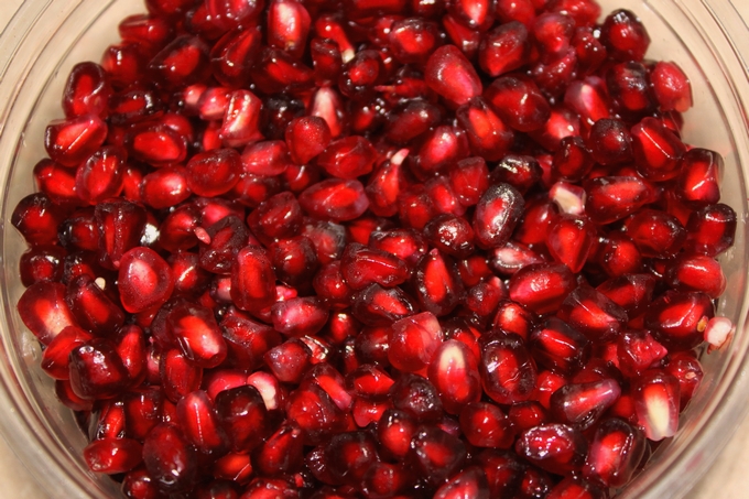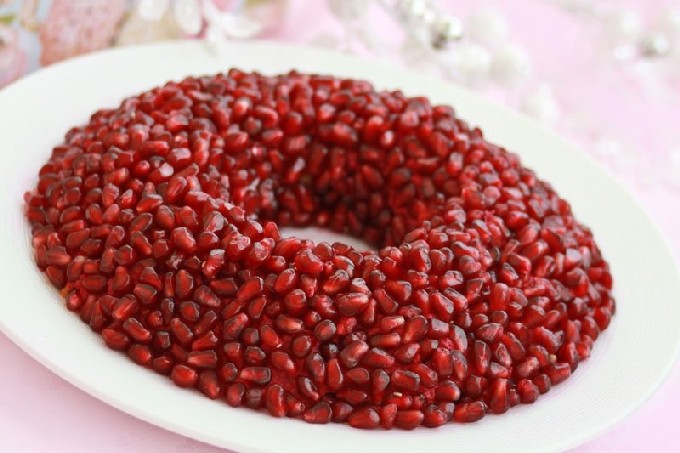 - Leg tot slot de granaatappelkorrels in een laag en probeer ze zo dicht mogelijk bij elkaar te leggen.