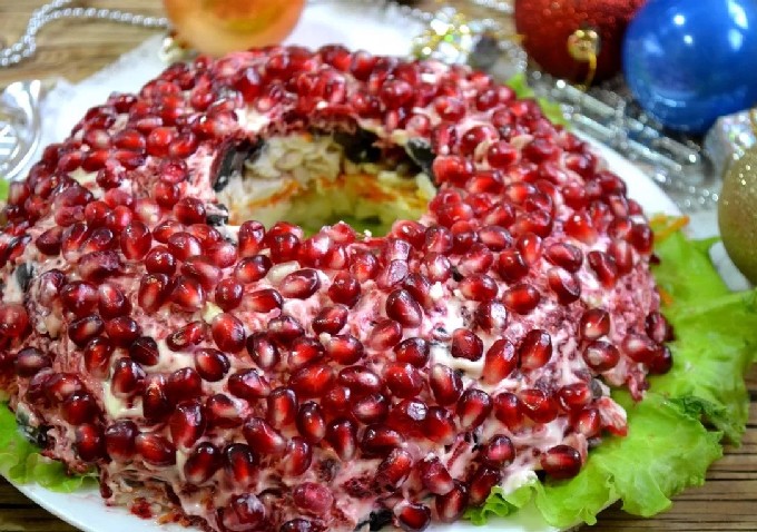 Het klassieke recept voor de Granaatappelarmbandsalade is met gekookte kipfilet. Ik ben onder de indruk van het recept met de toevoeging van pruimen, ik denk dat een ongewoon harmonieuze combinatie van lichte zoetheid met een neutrale kip zal blijken. Het zou nodig zijn om deze salade aan het nieuwjaarsmenu toe te voegen. Het is inderdaad dit gerecht dat de echte decoratie van de tafel is.