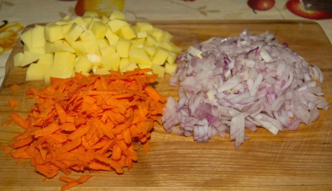 Schil de ui en snijd hem in kleine blokjes, bak hem op plantaardige basis tot een lichtrode tint. Giet 1 eetl in de pan. gekookt water, wacht tot het kookt en vergeet niet te roeren.