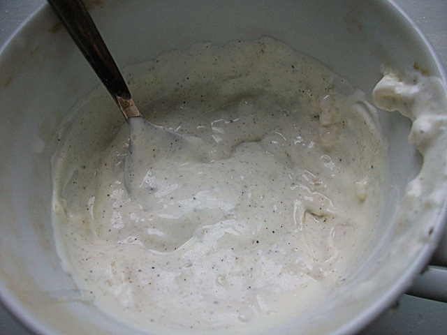 - Meng mayonaise, zout, peper en knoflook in een bord.