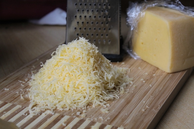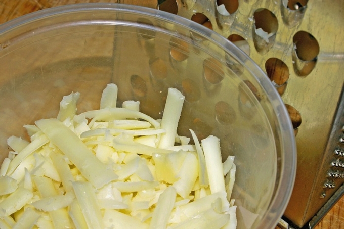 - We wrijven de kaas op een fijne rasp. Om ervoor te zorgen dat het niet plakt, moet je het bevochtigen met water.