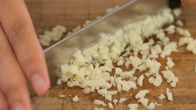 - Hak de knoflook fijn met een mes of gebruik een pers.