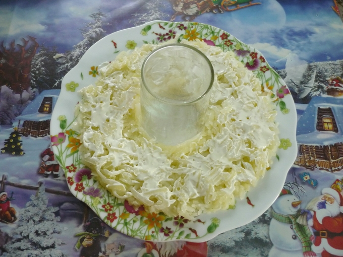 - We verzamelen de salade. We pakken een bord en zetten een glas in het midden. Leg er vervolgens de aardappelen omheen, vet het in met mayonaise.