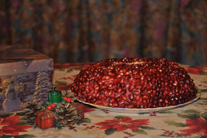 Voor de feestdagen moet ik het proberen. Op tafel ziet dit er prachtig uit, terwijl de ingrediënten van de "armband" algemeen verkrijgbaar zijn en tegen redelijke prijzen. Overigens is het hier ook belangrijk dat het gerecht een uitstekend "verbruiksartikel" van granaatappels is. Ze verdwijnen altijd in mijn koelkast, omdat ik niet het geduld heb om korreltje voor korreltje af te knijpen en te eten.