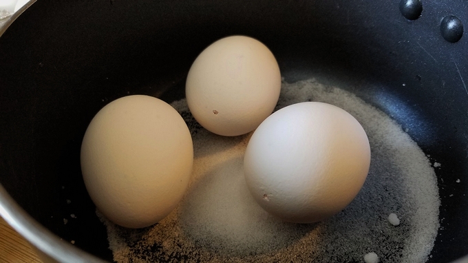 - Kook de eieren in een pan in gezouten water tot ze steil zijn.