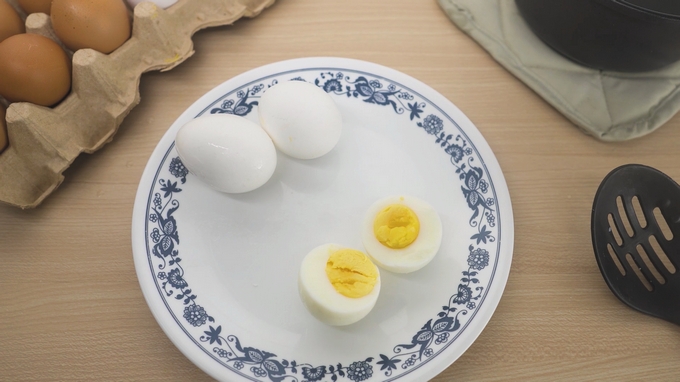 - Hardgekookte eieren. Koel af onder koud stromend water en snij met een mes.