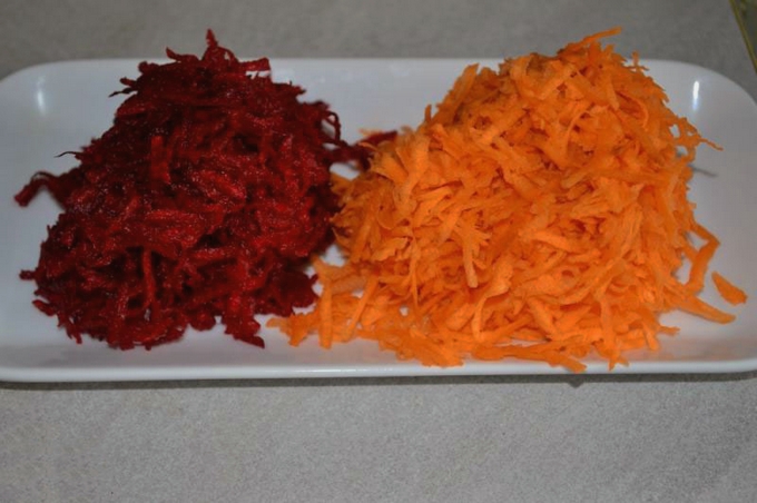 - We wrijven alle groenten in verschillende borden op een grove rasp.